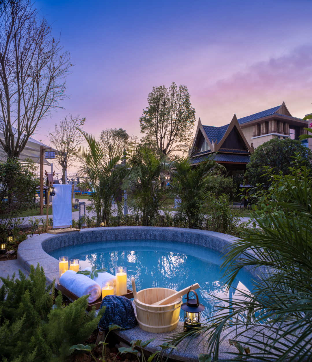 白天在山林间避暑赏景,呼吸带着草木清香的空气,夜晚无需远行,下楼便能泡入暖融融的汤泉,搭配一旁的冷水泳池,冷热交替间,尽是度假的轻松欢乐。